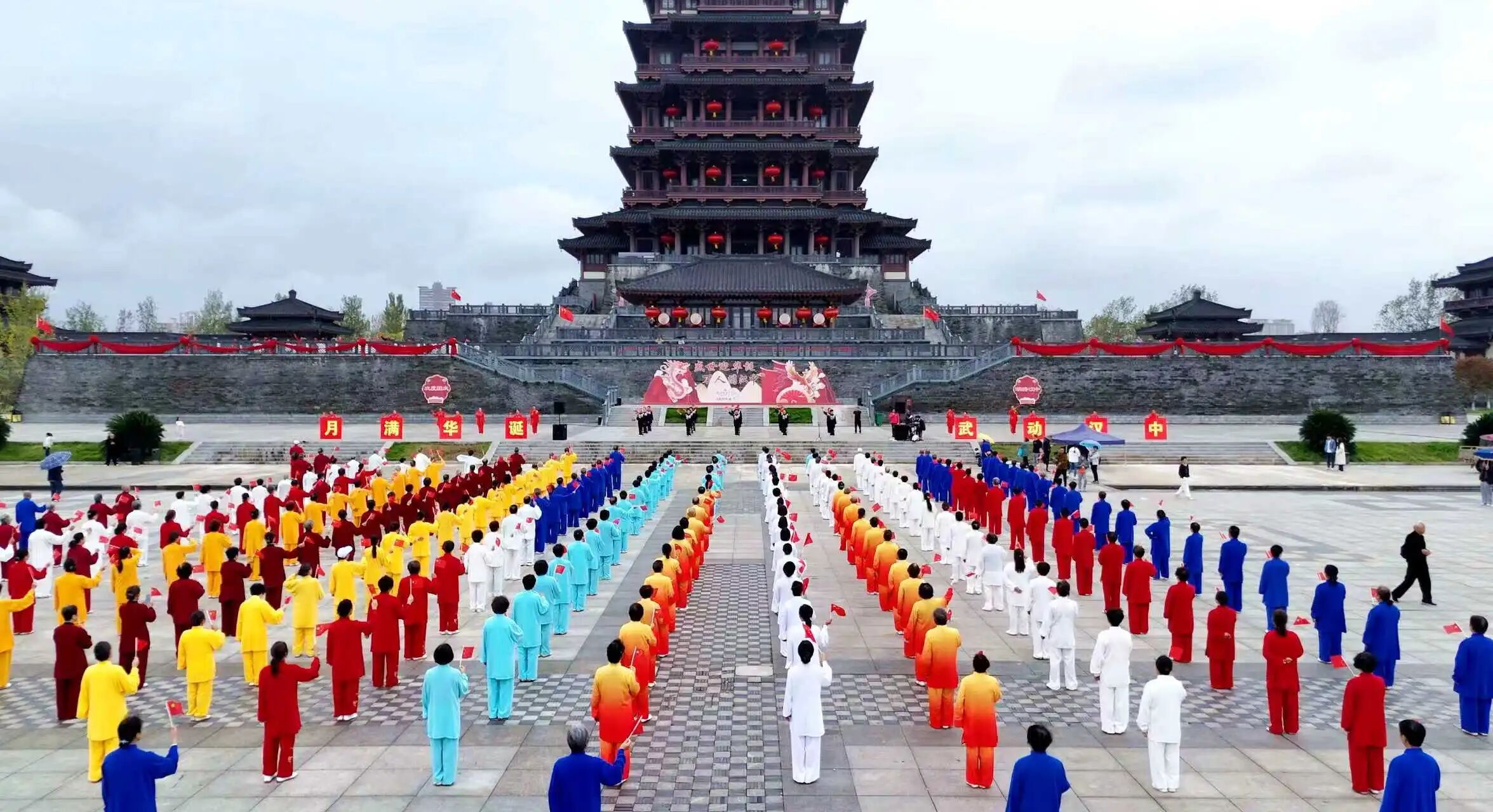 在天漢樓廣場,太極愛好者身著統一服裝整齊列隊,成為廣場上一道亮眼的風景線。隨著悠揚婉轉的音樂緩緩流淌,愛好者們抬手、轉身、屈膝,動作行云流水。