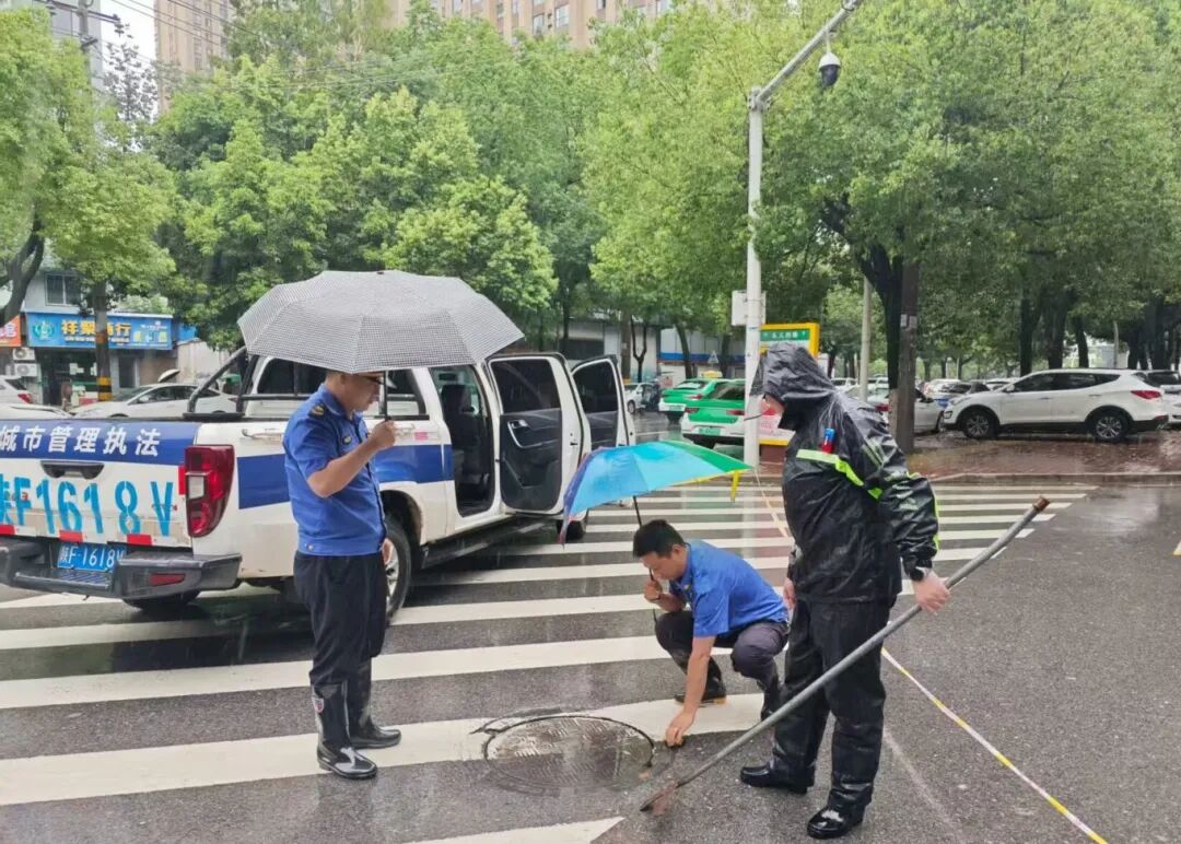 面對這場來勢洶洶的強降雨,路面積水、潛在險情接踵而至,漢臺城管執法人員聞“汛”而動,全力守護城市運行。漢中市城市管理綜合執法支隊漢臺大隊和各鎮街綜合行政執法隊嚴格落實汛期工作要求,緊盯氣象預警,在轄區易積水重點路段預置應急力量,執法人員提前打開道路雨水箅子,設置警示標識;實時監測汛情變化,及時疏導過往車輛;通過線上線下聯動,對低洼道路、地下通道、橋梁等易淹易澇點位實施線上線下精準監控,同時對可能出現的廣告招牌脫落、樹枝刮斷、大面積積水、井蓋缺失、路面塌陷等隱患進行實地排查處置。
