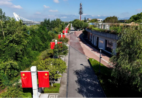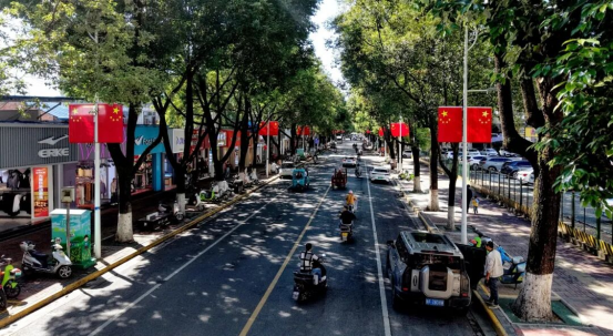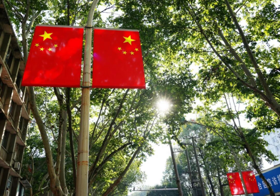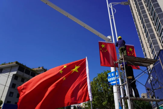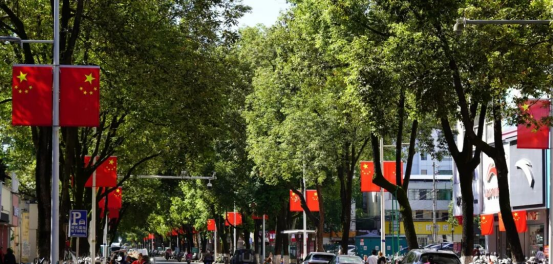 一面面鮮艷的五星紅旗整齊懸掛于燈桿兩側,