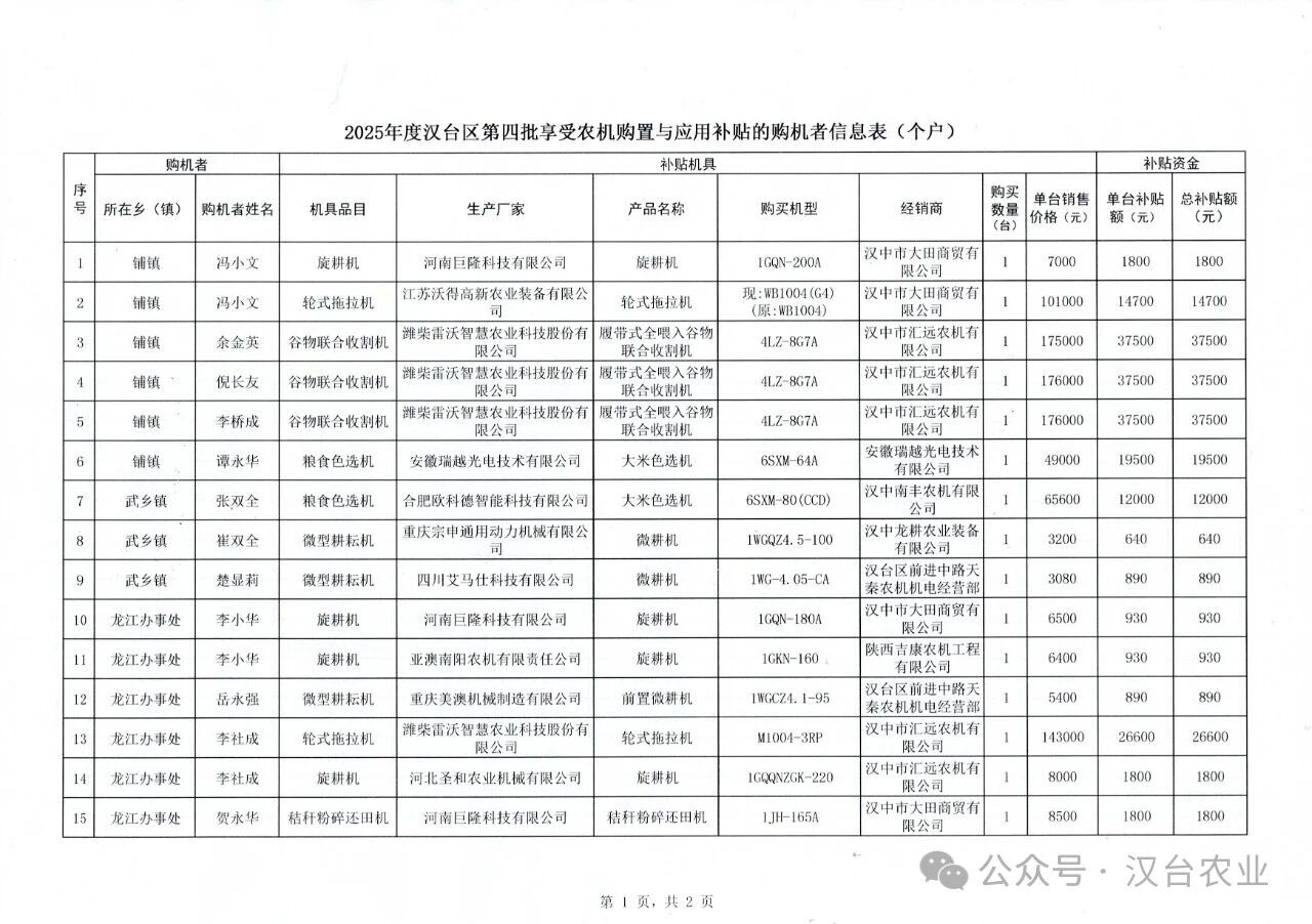 漢中市漢臺(tái)區(qū)農(nóng)業(yè)農(nóng)村局2025 年度漢臺(tái)區(qū)第四批(個(gè)戶(hù))享受農(nóng)機(jī)購(gòu)置與應(yīng)用補(bǔ)貼公示