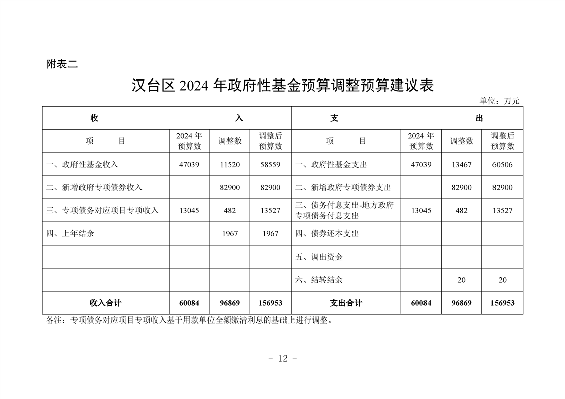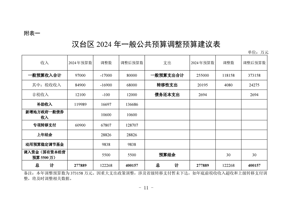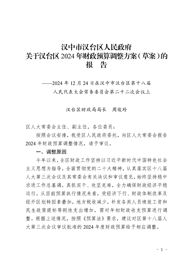漢中市漢臺區人民政府關于漢臺區2024年財政預算調整方案(草案)的報告