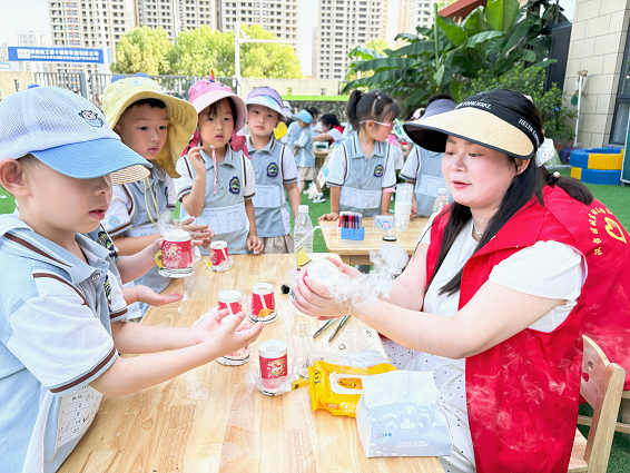科技節的舞臺上,創意與想象肆意生長。陽光漫過幼兒園的長廊,孩子們化身小小科學家,在光影流轉間探尋世界的奧秘。透明的玻璃容器里,彩虹般的液體層層暈染,像極了孩子們心中絢爛的夢;當白霧漫過掌心,干冰正將固態的月光幻化成飄渺的銀河。那些翻騰涌動的霧靄,是科學在起舞,用最詩意的姿態,訴說著低溫世界的魔法與浪漫。這些充滿童趣的實驗,是孩子們與科學的初次對話,在他們心中播下探索的火種。