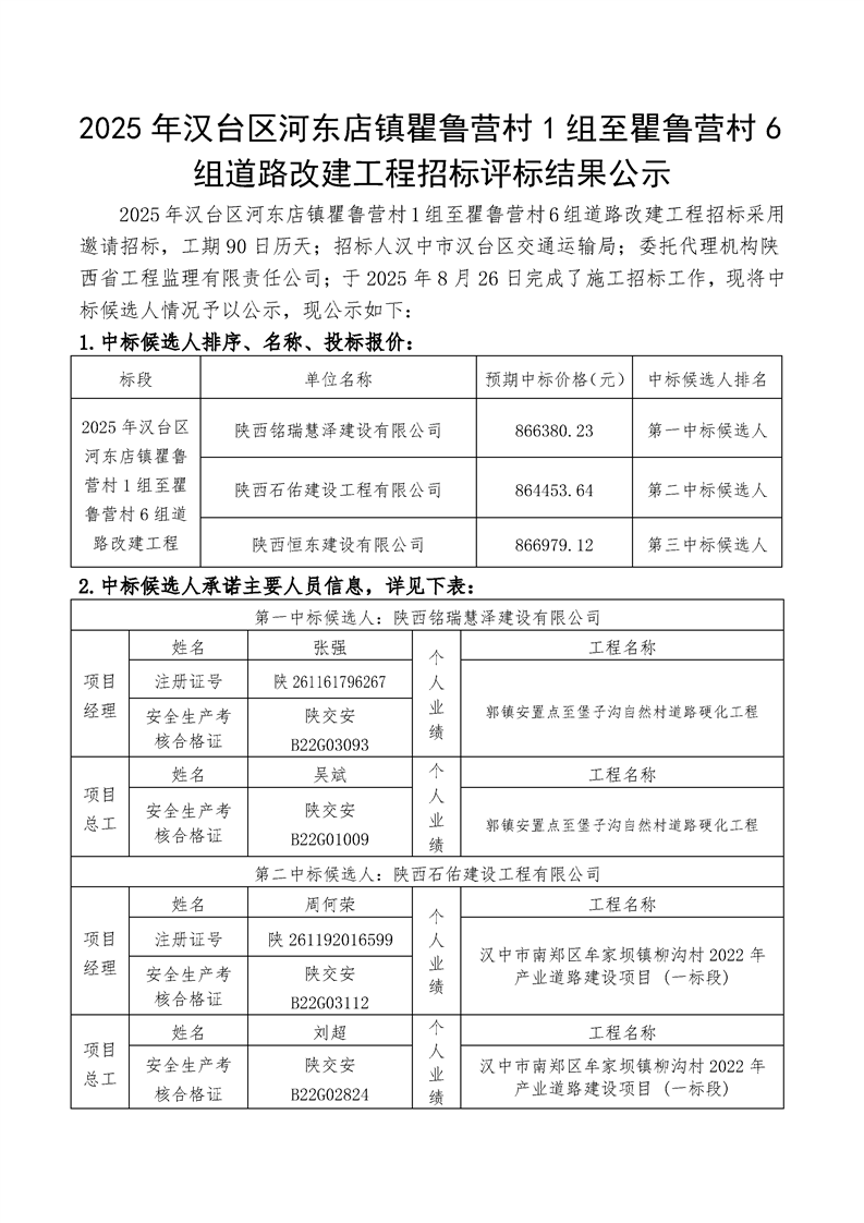 2025年漢臺(tái)區(qū)河?xùn)|店鎮(zhèn)瞿魯營(yíng)村1組至瞿魯營(yíng)村6組道路改建工程招標(biāo)評(píng)標(biāo)結(jié)果公示